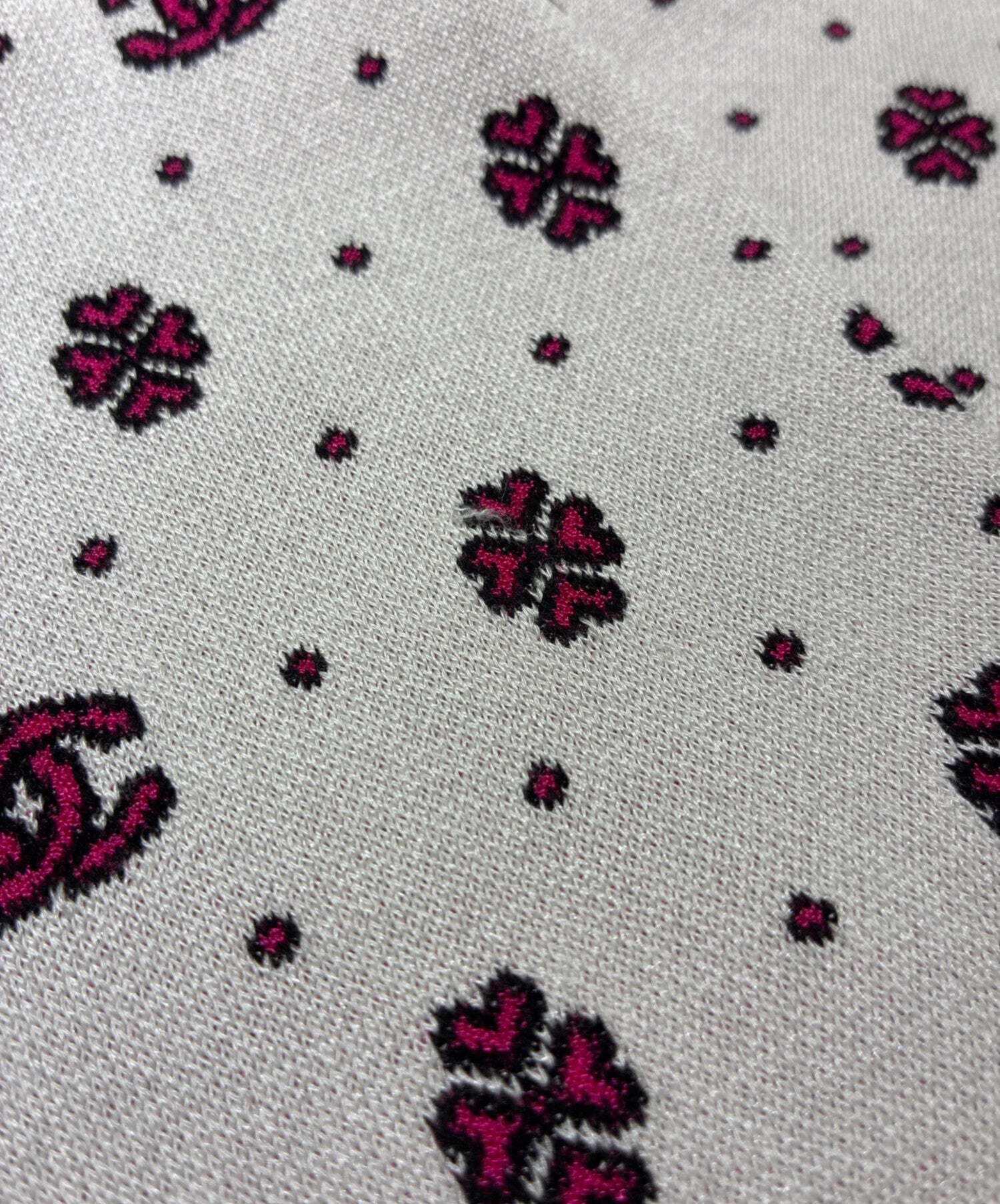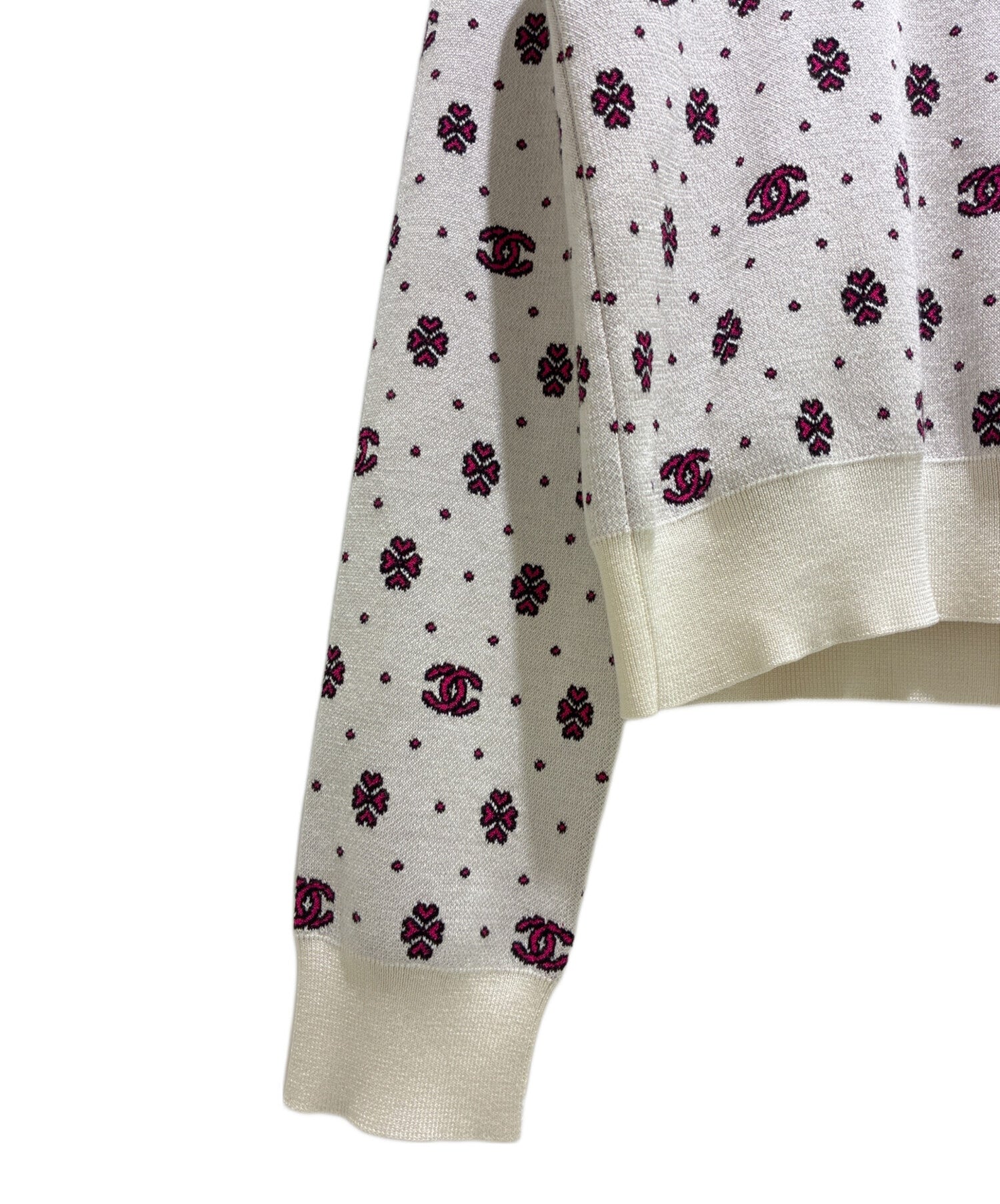 | Comment | This is a CHANEL half-zip nordic knit with a vivit pink coco mark and clover design throughout. The material is made of fine silk and cotton, with a soft and shiny texture. |