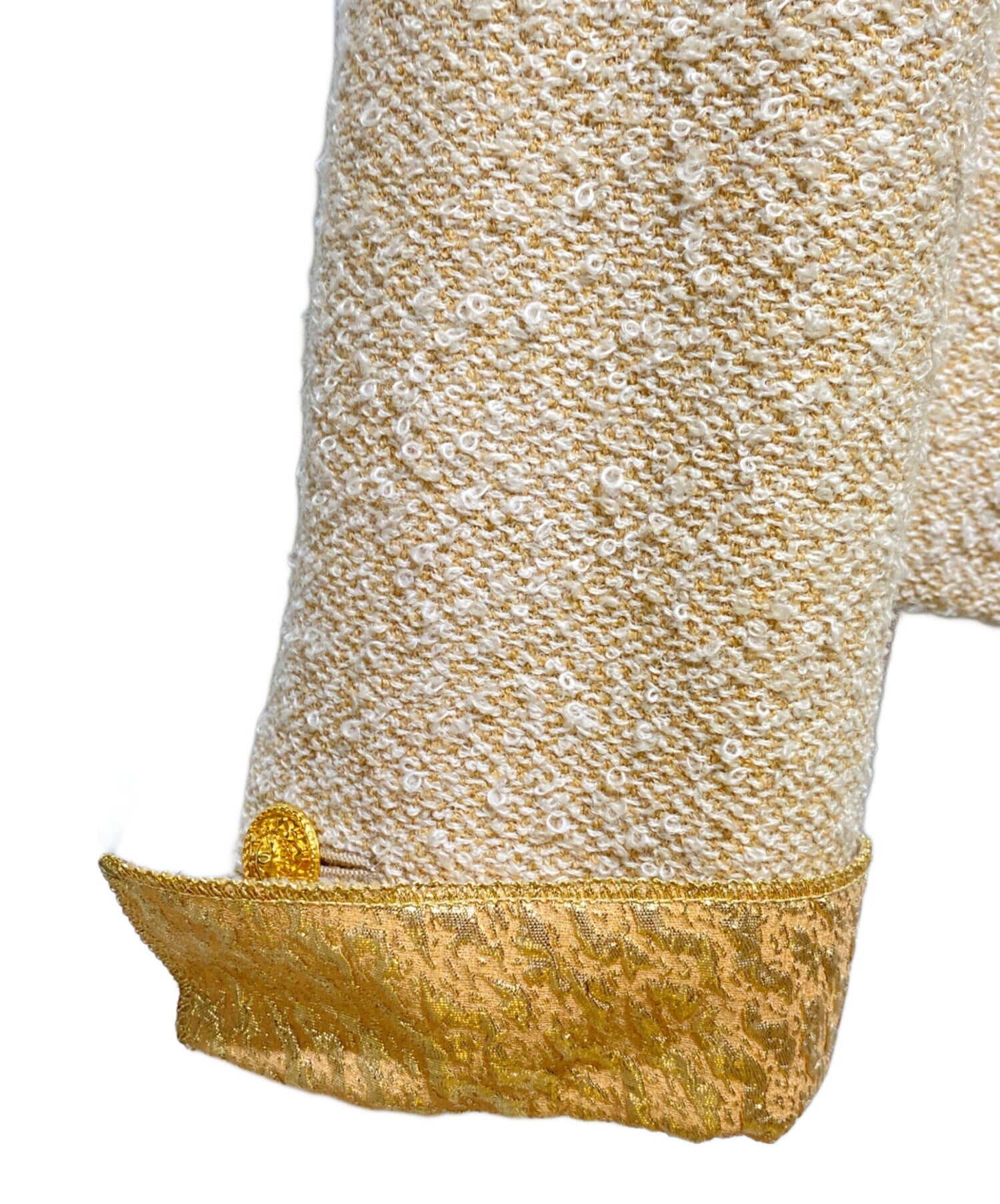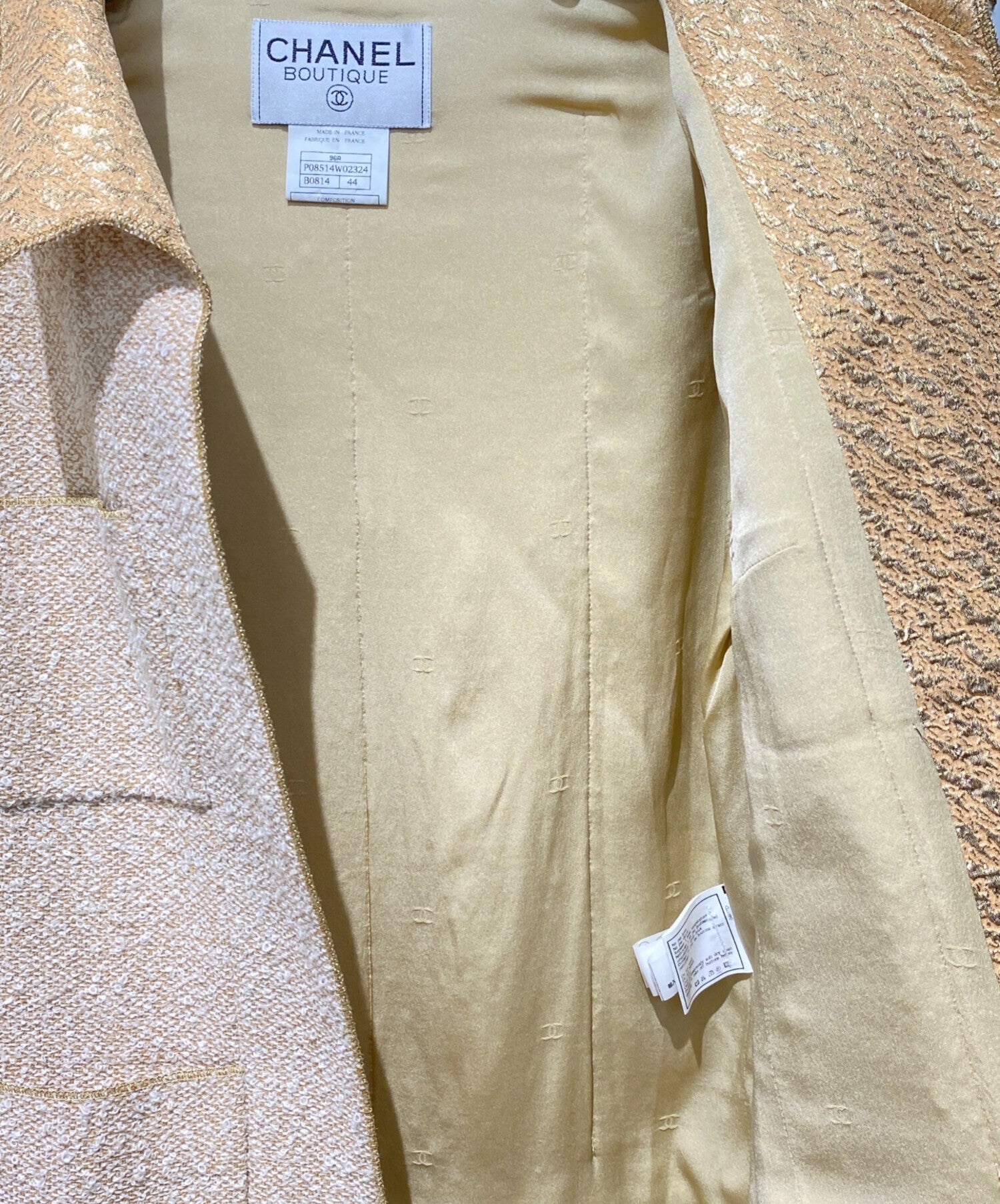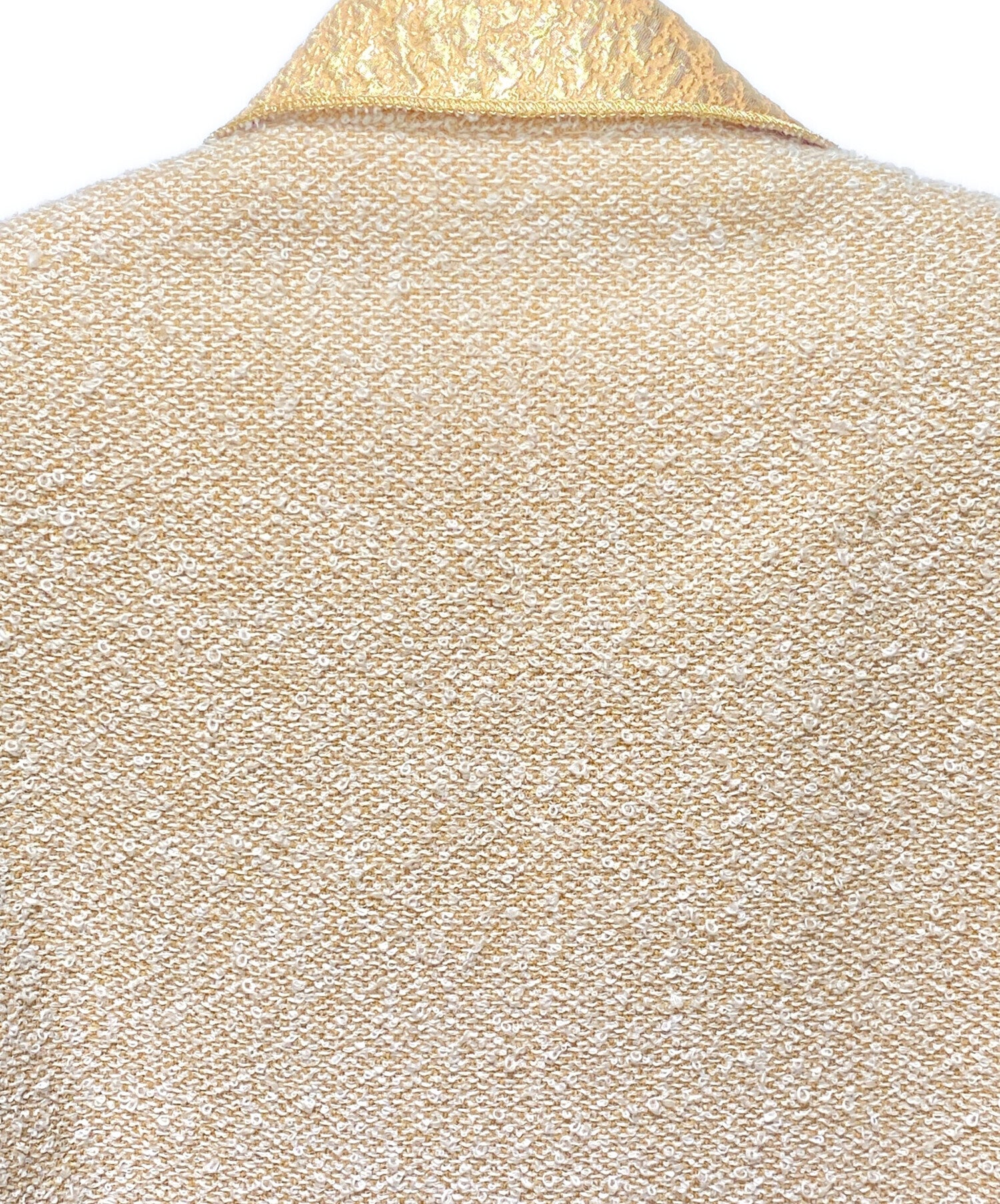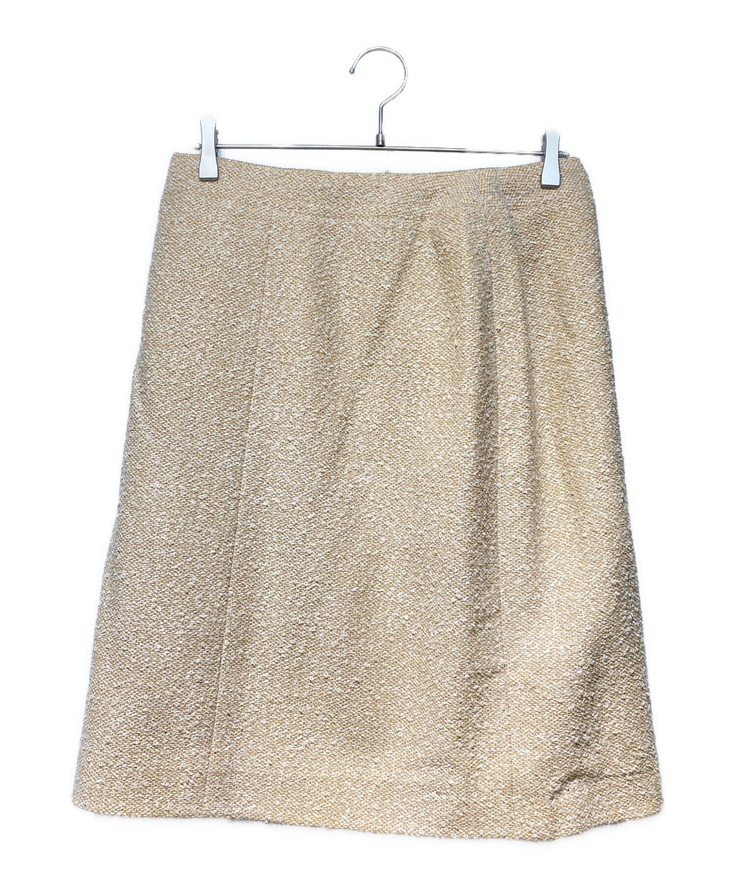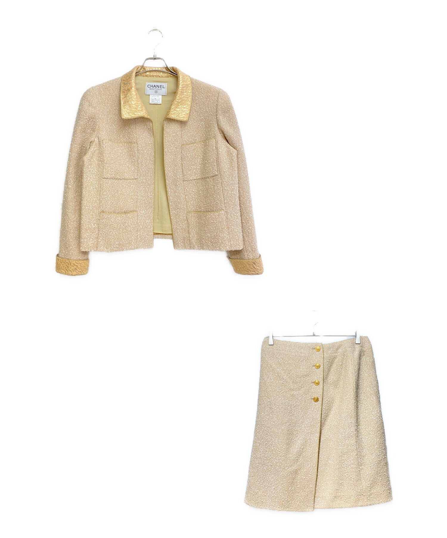 | Comment | This is a skirt set-up with a tweed design typical of CHANEL. The beige color is combined with gold lamé thread, making it a simple yet luxurious item. The buttonless jacket combines roughness and luxury, and is a wardrobe staple that can be used for both everyday use and special occasions. |